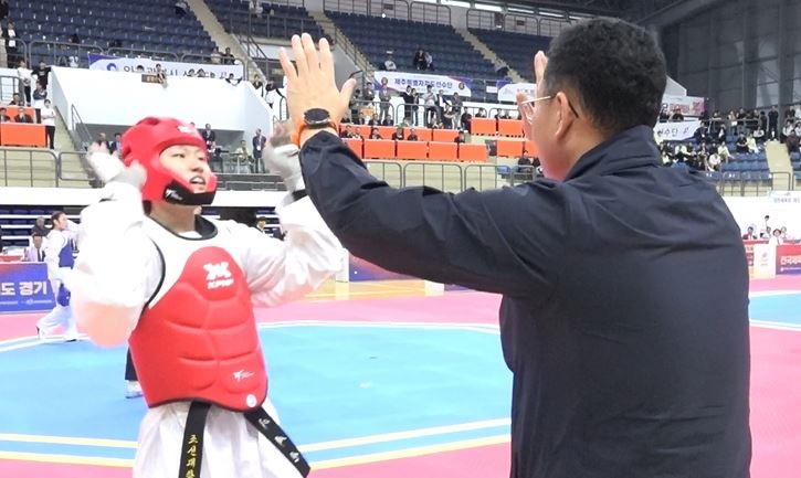 여자대학부 -57kg급 결승에서 김민경 선수(광주)가 3라운드에서 역전승을 거둔 후 코치와 기쁨을 나누고 있다.