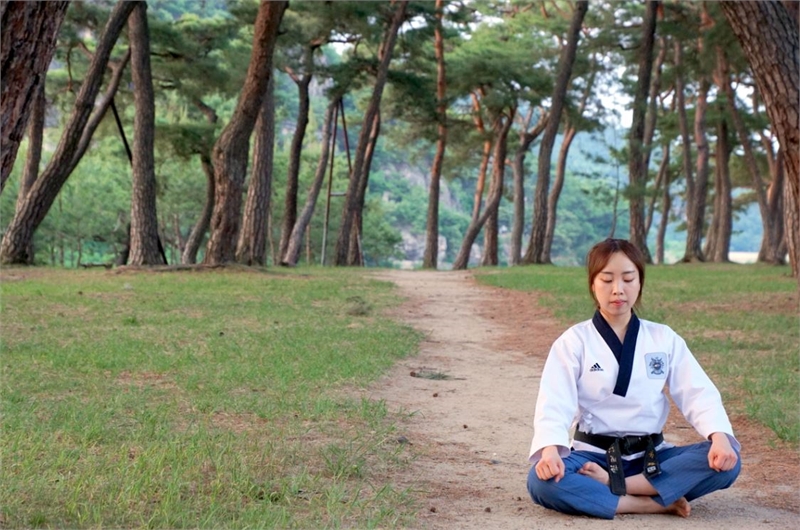 강유진 사범이 경북 안동의 한 숲 속에서 명상을 하고 있다.