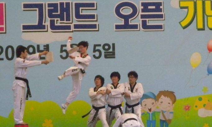 2009년 필자 태권도장 드래곤시범단 초등학생들이 어린이대공원 오픈 기념식에서 격파를 하고 있다.