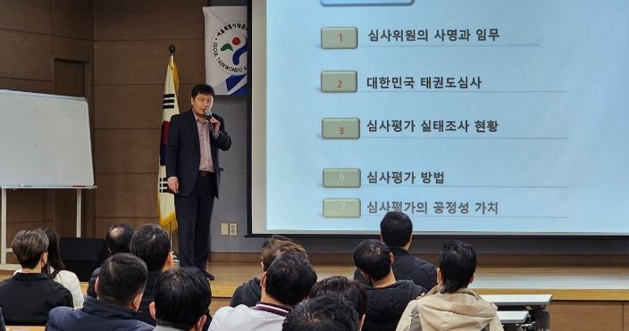 2023년 필자가 서울시태권도협회 유품단자 심사평가위원 강습회에서 강의를 하고 있다.