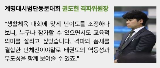“생활체육 대회에 맞게 난이도를 조정하다 보니, 누구나 참여할 수 있으면서도 교육적 의미를 살리고 싶었습니다. 입시를 준비하는 학생들이 품새를 필수로 배우는 점도 고려해, 격파 안에 품새 요소를 넣게 되었죠.”