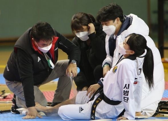 차진영 서울본브릿지병원 행정원장이 태권도 경기자에서 다친 선수의 부상 부위를 살펴보고 있다.