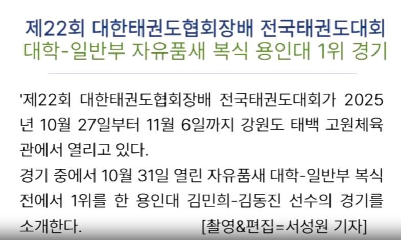 경기 대회 [영상 뉴스] 용인대, 자유품새 페어전 1위 서성원 기자 승인 2025.12.17 18:48 | 최종 수정 2025.12.17 18:49 0 0 0 태권투데이미디어 서성원 기자 tkdssw@naver.com 서성원 기자의 기사 더보기 저작권자 ⓒ 태권투데이미디어, 무단 전재 및 재배포 금지