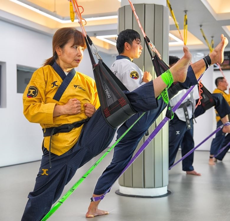지난해 12월 제이칼리쿠 품새팀 선수들이 정기훈련을 하고 있다. 밴드를 걸고 차는 훈련은 고관절의 가동성과 발차기시에 필요한 밸런스 강화운동이다.
