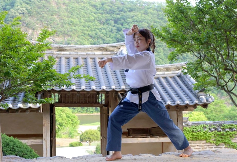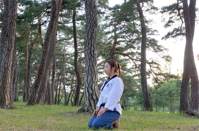 첩첩산중 울울창창한 맑은 숲. 경북 안동 병산서원을 에워싸고 있는 신록 속에서 강유진 사범(수원 남창도장)이 도복을 입고 묵상을 하고 있다. 맨 발로 맨 땅을 걸으며, 아름드리 소나무 숲을 벗 삼아 수련을 하고 있다.