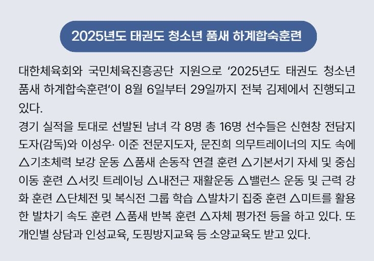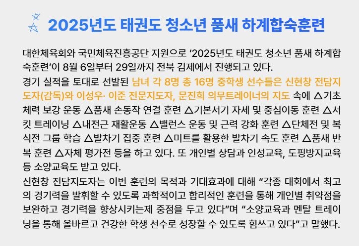영상 뉴스 [현장] 2025 태권도 청소년 품새대표 하계합숙훈련 서성원 기자 승인 2025.08.26 16:41 | 최종 수정 2025.08.26 16:59 0 1 0 태권투데이미디어 서성원 기자 tkdssw@naver.com 서성원 기자의 기사 더보기 저작권자 ⓒ 태권투데이미디어, 무단 전재 및 재배포 금지