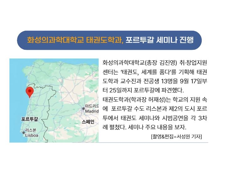 영상 뉴스 화성의과학대 태권도학과, 포르투갈 세미나 서성원 기자 승인 2025.09.26 15:25 0 15 0 태권투데이미디어 서성원 기자 tkdssw@naver.com 서성원 기자의 기사 더보기 저작권자 ⓒ 태권투데이미디어, 무단 전재 및 재배포 금지