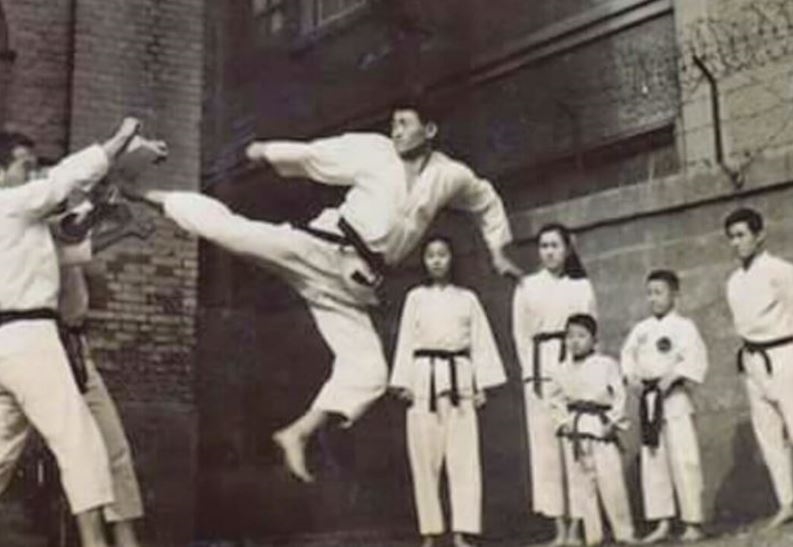 1960년대 후반 20대 시절 이관영 사범이 옆차기를 하고 있다.(사진 왼쪽). 사진=이관영 사범