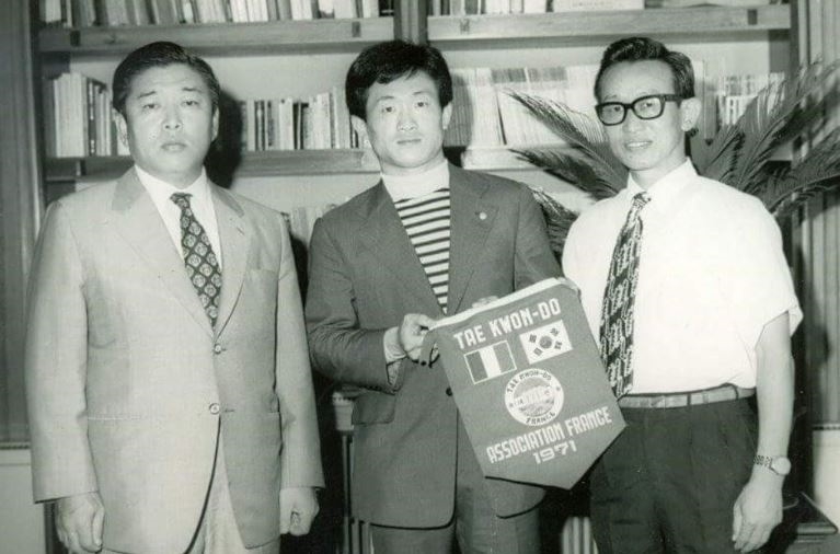 1971년 프랑스에서 활동하던 이관영 원로(가운데)가 대한태권도협회를 방문해 김운용 회장, 엄운규 사무총장과 포즈를 취하고 있다. 사진=대한태권도협회