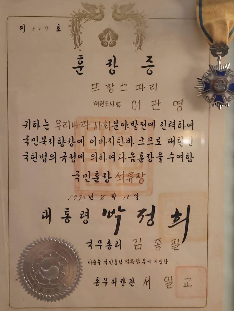 그 후 1975년 5월 국기원에서 열린 제1회 세계태권도선수권대회에 프랑스대표팀을 이끌고 참가하는 등 프랑스에 태권도를 보급하며 국위선양에 기여한 공고를 인정받아 국민훈장 석류장을 수상했다.