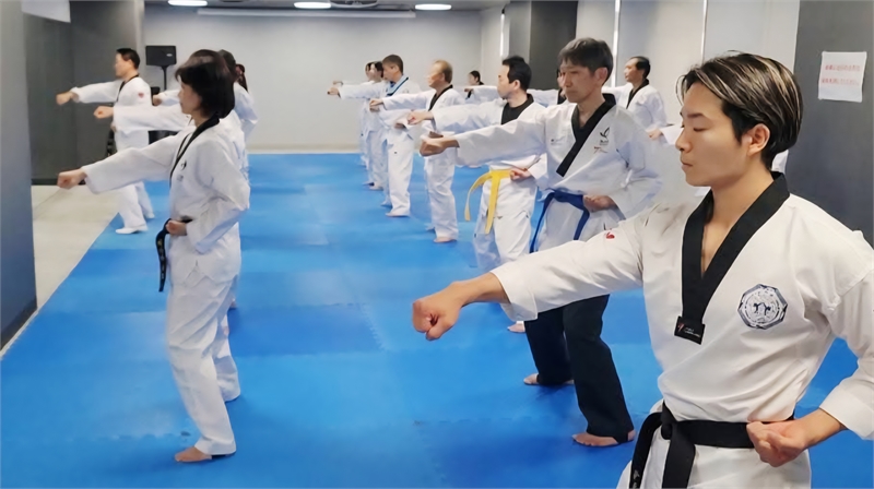 2025년 6월, 이광호 사범(왼쪽 앞줄)이 주(駐)오사카 한국문화원에서 열린 태권도 강좌 시간에 일반인들에게 태권도를 가르치고 있다.