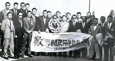 1965년 10월, 최홍희가 ‘태권도구아사절단’을 이끌고 해외 순회시범에 나서자 대한태권도협회 임원들이 김포공항에서 환송식을 하고 있다. 환영 펼침막에 한자로 '태권도'가 씌여져 있다. (사진 출처:김병수 사범)