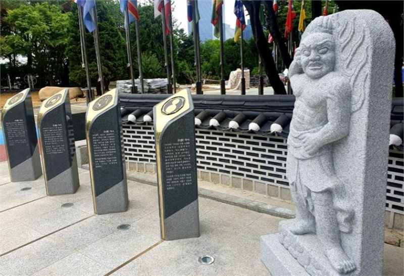국기원이 조성한 '9대관 조형 기념물' 옆에 금강역사상이 놓여져 있다.