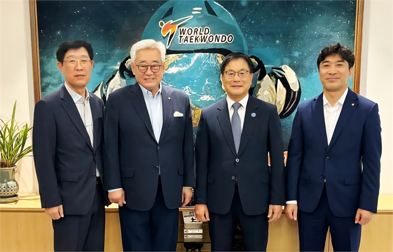 지난달 26일, 윤웅석 신임 국기원장(왼쪽에서 세번째)이 이종갑 신임 국기원 이사와 함께 세계태권도연맹을 방문해 조정원 총재와 서정강 사무총장과 환담 후 기념사진을 촬영하고 있다.