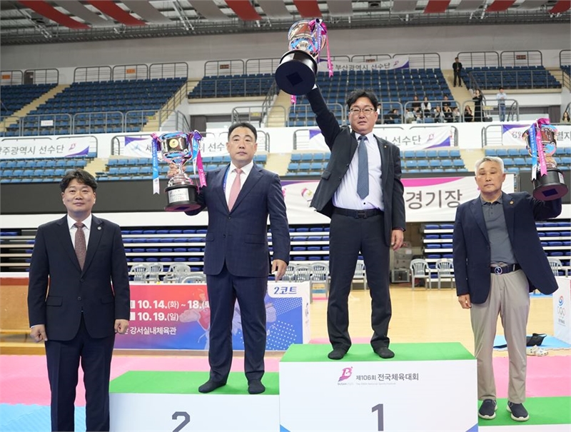 제106회 부산 전국체육대회 태권도 종목 종합시상식에서 경기도태권도선수단 이명두 총감독이 우승컵을 들고 기뻐하고 있다.