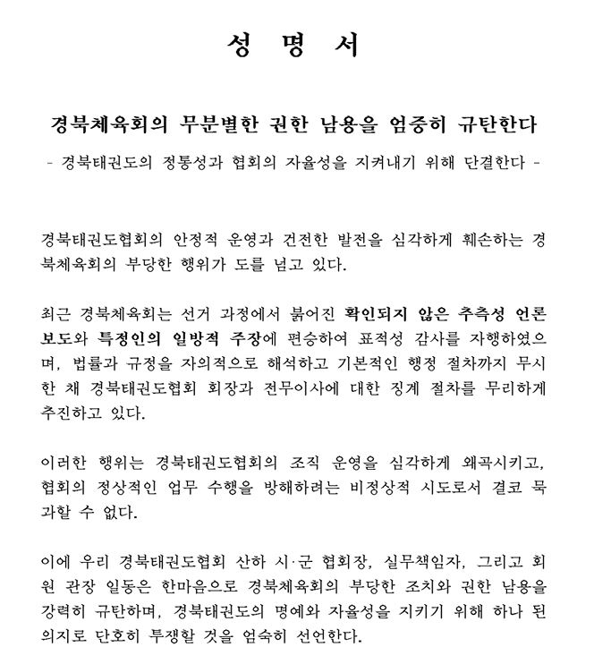 이들이 내건 성명서의 취지는 경북 태권도의 정통성과 협회의 자율성을 지켜내기 위해서다. 이들은 “경북협회의 안정적 운영과 건전한 발전을 심각하게 훼손하는 경북체육회의 부당한 해우이가 도를 넘고 있다”며 “이러한 행위를 경북협회의 조직 운영을 심각하게 왜곡시키고, 협회의 정상적인 업무 수행을 방해하려는 비정상적 시도로써 결코 묵과할 수 없다”고 밝혔다.