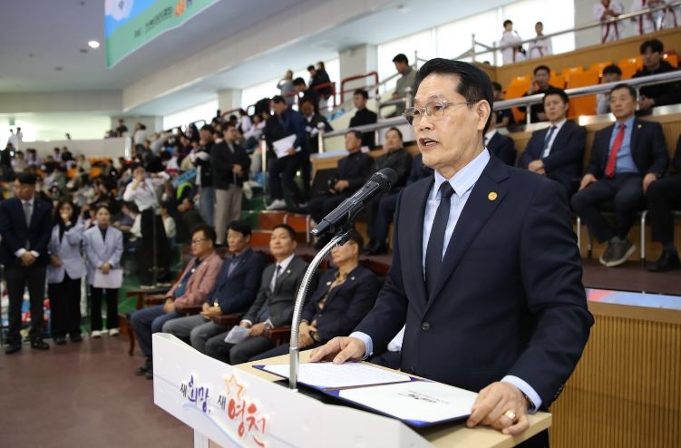 지난 11월 3일 이성우 경북태권도협회 회장이 영천체육관에서 열린 독도수호태권도대회에서 개회사를 하고 있다.