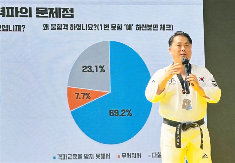 지난 7월, KTA가 주최한 ‘2025 춘천 KTA 태권도장 교육·산업박람회’에서 정상민 교육강사가 위력격파의 문제점과 미래의 가능성에 대해 말하고 있다.