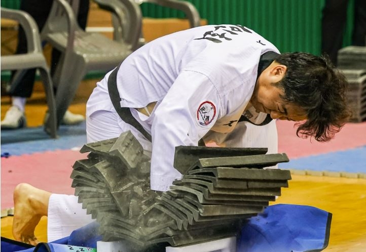 2024년 경북 문경에서 열린 세계태권도한마당에서 정상민 선수가 국내 주먹격파 남자 시니어Ⅲ 결선에서 15장의 기왓장을 완파하고 있다. 사진=THE 태권(http://www.thetkd.co.kr)