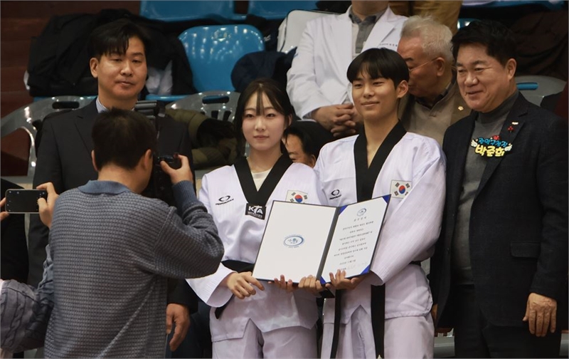 12월 6일 개회식에서 박준희 관악구청장(오른쪽)과 최훈민 관악구태권도협회 회장(왼쪽)이 선수 대표로 선서를 한 선수들과 기념사진을 촬영하고 있다.